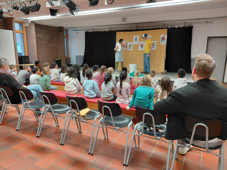 Am Freitag, 14.11.2025 waren zwei Schauspieler der theaterpädagogischen Werkstatt Osnabrück an unserer Schule zu Gast, um den Kindern der ersten und zweiten Klassen das Stück „Die große Nein-Tonne“ zu präsentieren. In kindgerechten Situationen zeigten sie, dass man sich manchmal in einer Begegnung oder im Ungang mit anderen nicht wohlfühlt, man ein Nein-Gefühl im Bauch hat. Es wurde Mut gemacht und Ideen gezeigt, wie man mit diesen Gefühlen umgehen kann und wo es Hilfe gibt. Gemeinsam wurde mit einem Spruch die unangenehme Situation bildlich in die Nein-Tonne gepackt. Nach dem Stück sprachen die Schauspieler mit den Kindern noch einmal über die gezeigten Situationen und ihre Lösungsmöglichkeiten. Auch Frau Schmithüsen besuchte in der folgenden Schulwoche alle ersten und zweiten Klassen für eine Nachbesprechung des Theaterstücks.